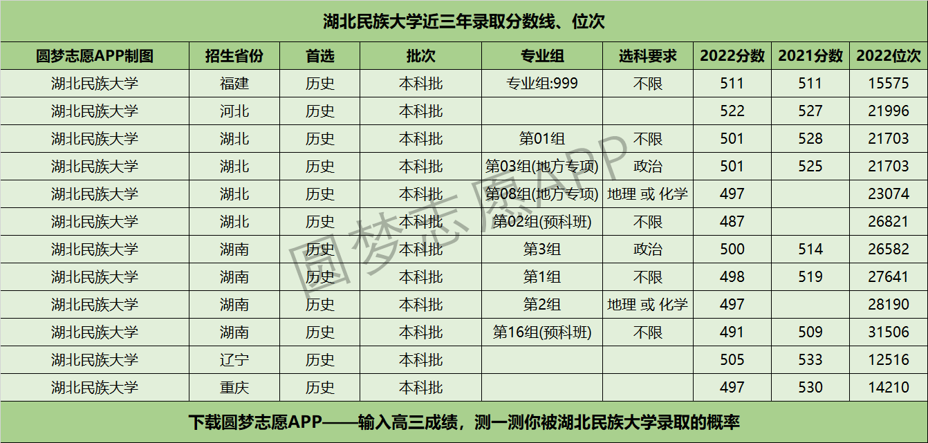 四、湖北民族大学近年录取分数线及位次【首选历史版】