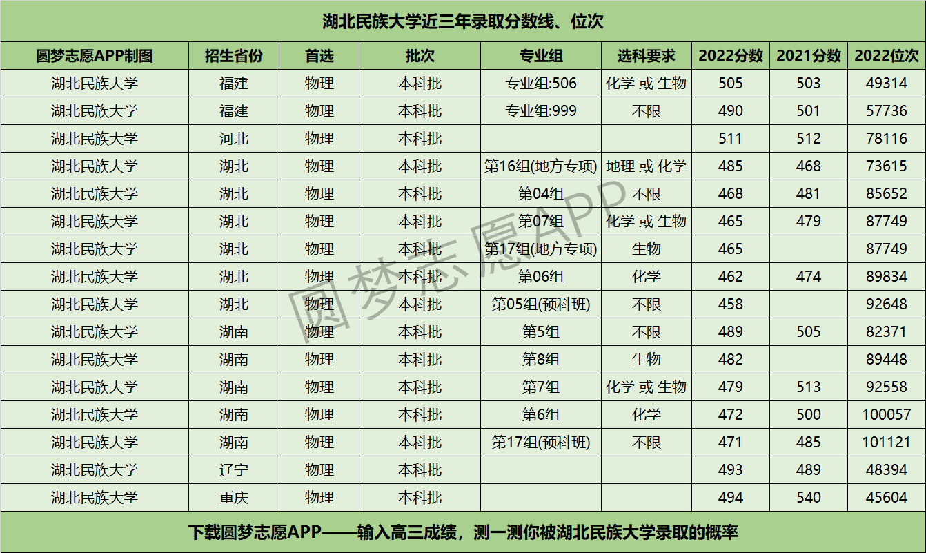 三、湖北民族大学近年录取分数线及位次【首选物理版】