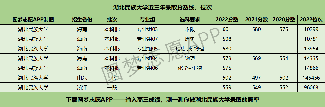 五、湖北民族大学近年录取分数线及位次【6选3省份】