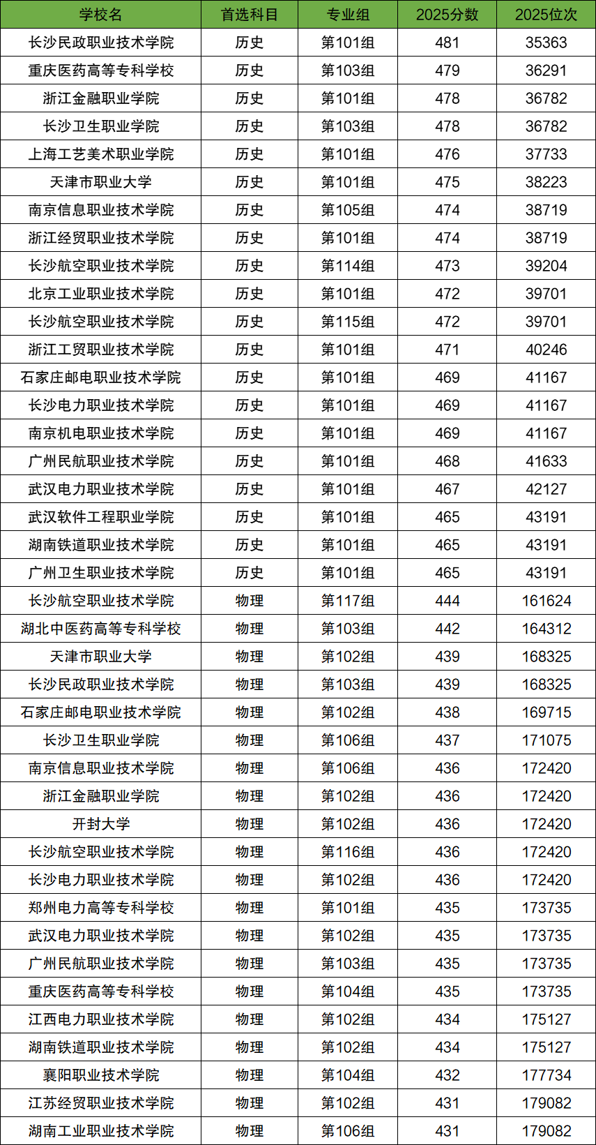 全国公办专科大学在湖南物理类录取分数线最高的是:长沙航空职业技术学院第117组,2025年最低分数线是444分,位次排名是161624位,超过专科线244分;录取分数线最低的是:永州师范高等专科学校第105组,2025年最低分数线是264分,位次排名是306965位,超过专科线64分。