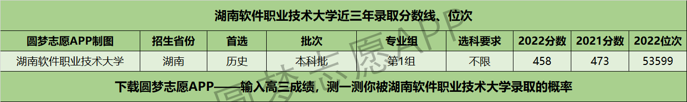 以湖南软件职业技术大学在湖南近年首选历史的招生情况为例,学校2022年在本科批的最低分为458分,2021年在本科批的最低分为473分,两年的最低分范围为458~473分。