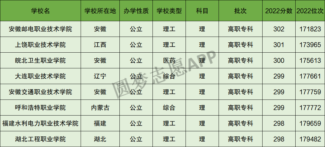 江西省300分左右的理科专科大学有安徽邮电职业技术学院、上饶职业技术学院、皖北卫生职业学院、大连职业技术学院、安徽交通职业技术学院、呼和浩特职业学院、福建水利电力职业技术学院、湖北工程职业学院等8所大学,均为公立大学。