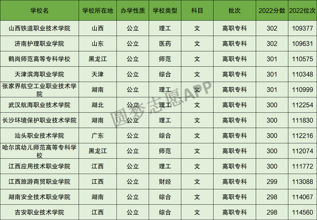 江西省300分左右的文科专科大学有山西铁道职业技术学院、济南护理职业学院、鹤岗师范高等专科学校、天津滨海职业学院、张家界航空工业职业技术学院、武汉航海职业技术学院、长沙环境保护职业技术学院、汕头职业技术学院、哈尔滨幼儿师范高等专科学校、江西应用技术职业学院等13所大学,均为公立大学