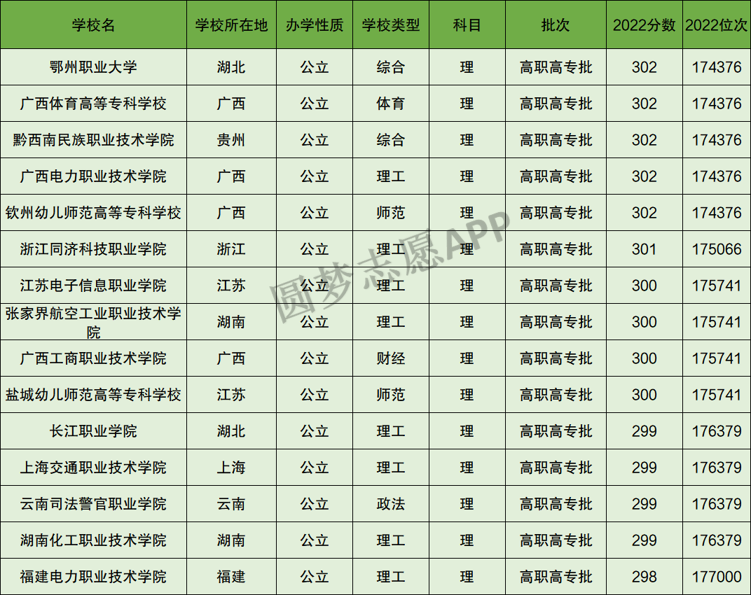 广西壮族自治区300分左右的理科专科大学有鄂州职业大学、广西体育高等专科学校、黔西南民族职业技术学院、广西电力职业技术学院、钦州幼儿师范高等专科学校、浙江同济科技职业学院、江苏电子信息职业学院、张家界航空工业职业技术学院、广西工商职业技术学院、盐城幼儿师范高等专科学校等15所大学,均为公立大学。