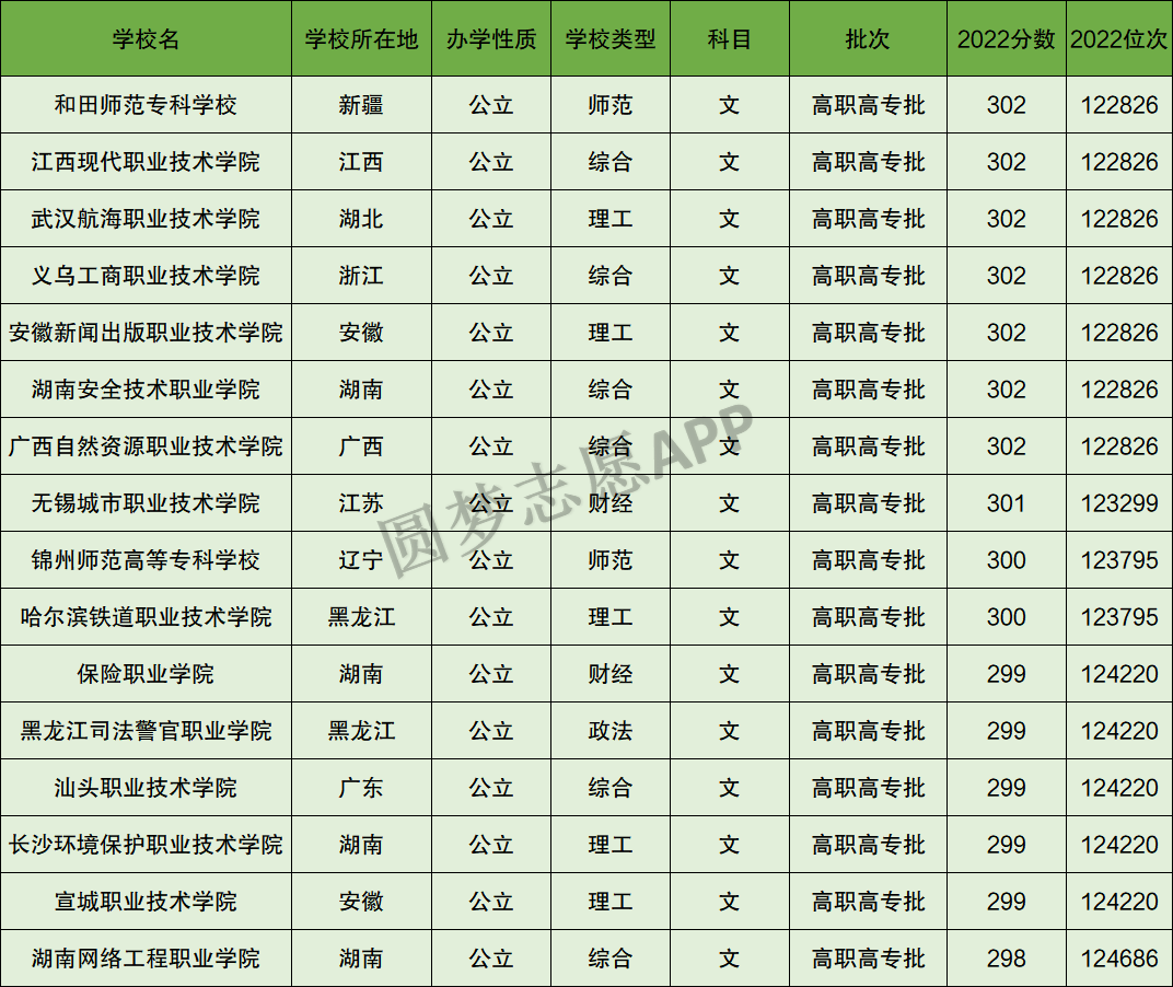 广西壮族自治区300分左右的文科专科大学有和田师范专科学校、江西现代职业技术学院、武汉航海职业技术学院、义乌工商职业技术学院、安徽新闻出版职业技术学院、湖南安全技术职业学院、广西自然资源职业技术学院、无锡城市职业技术学院、锦州师范高等专科学校、哈尔滨铁道职业技术学院等16所大学,均为公立大学