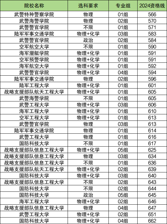 武警特种警察学院(01组,选科物理,566分)、武警海警学院(02组,选科物理,570分)、陆军军事交通学院(02组,选科物理,596分)、武警警官学院(03组,选科物理,613分)、陆军军事交通学院(01组,选科物理,614分)等。