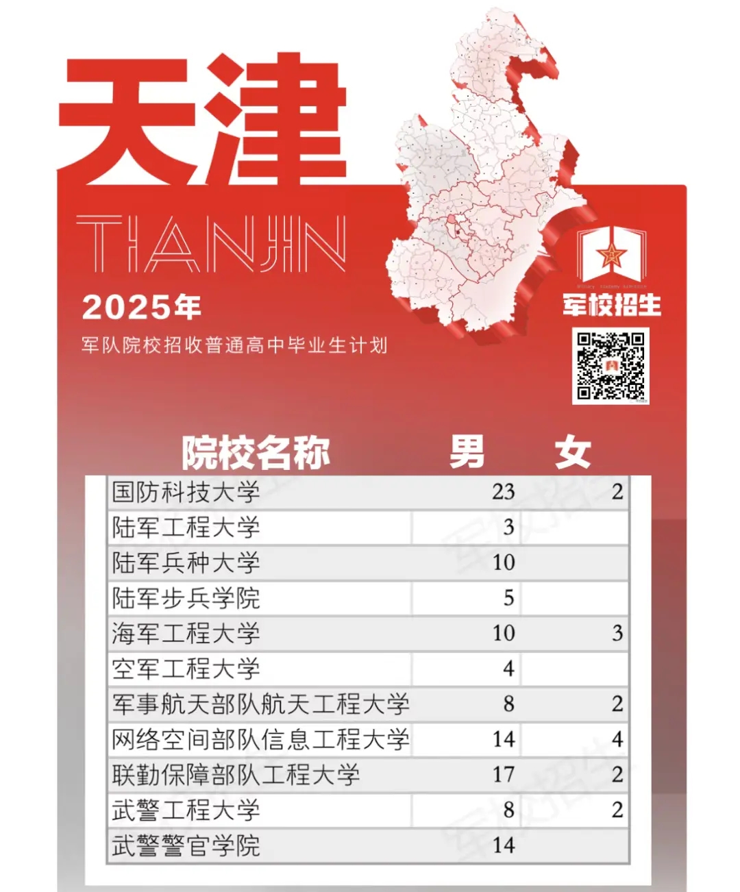 军事教育局发布的2025年军校在天津招生计划表显示,招生军校数量共计11所,各院校招生计划数总共为131人,其中招男生116人,招女生15人。