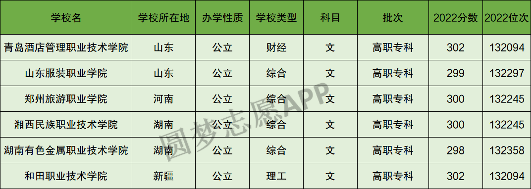 云南省300分左右的文科专科大学有青岛酒店管理职业技术学院、山东服装职业学院、郑州旅游职业学院、湘西民族职业技术学院、湖南有色金属职业技术学院、和田职业技术学院等6所大学,均为公立大学