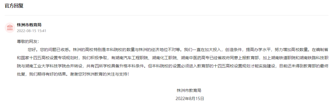 8月15日,株洲市教育局在人民网领导留言板就网友“株洲增添若干所本科院校,提升株洲城市品味”的建议进行回复,其中提到,湖南铁道职业技术学院、湖南铁路科技职业技术学院与湖南工业大学科技学院将合并转设为湖南铁道职业技术大学(暂定名)。