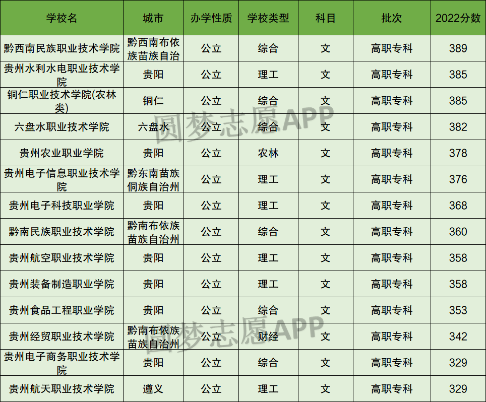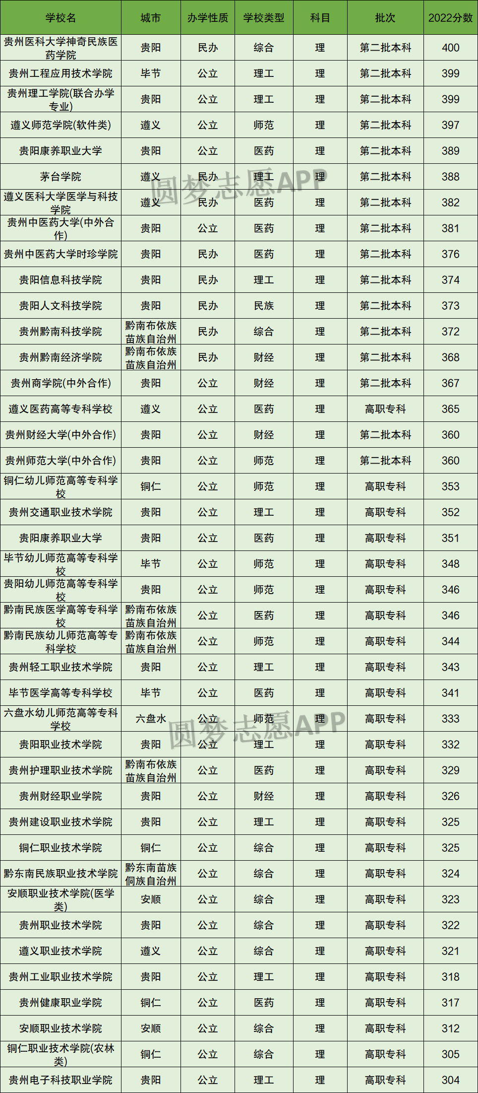 2022年贵州省理科二本线为360分,因此贵州省300到400分的理科大学有本科批大学和专科批大学。