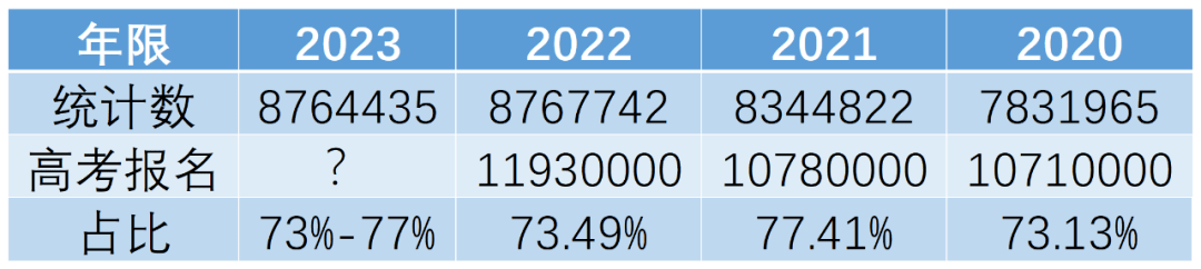 按照73%—77%比例范围来看,2023年高考报名人数范围在1132—1198万之间。