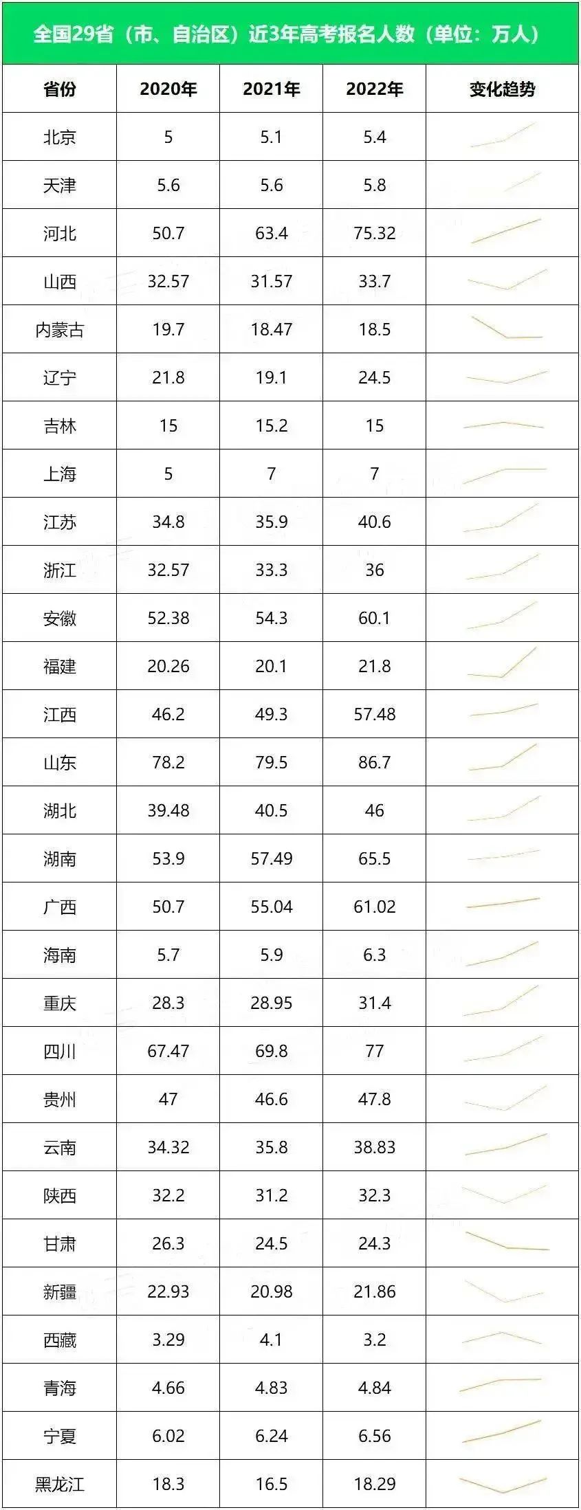 以下是全国29省(市、区)近3年高考报名人数统计: