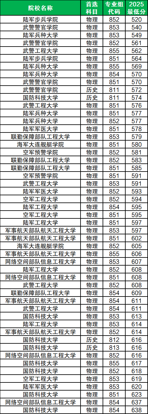2025年在广西物理类招生分数线较低的军校有: