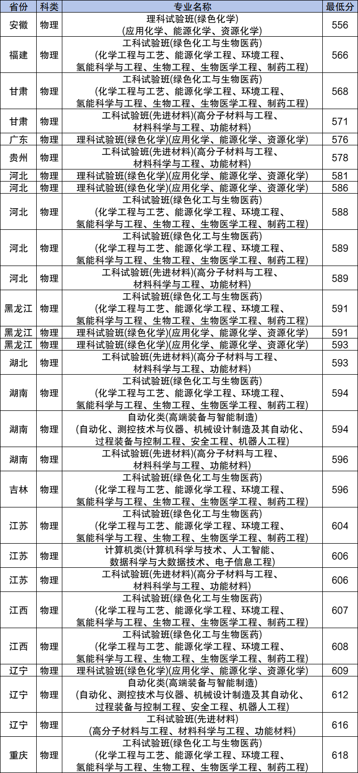 理科:工科试验班(先进材料)602分、工科试验班(绿色化工与生物医药)604分、理科试验班(绿色化学)621分