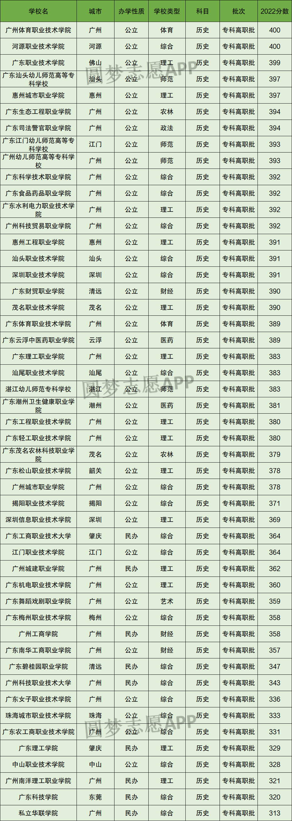 2022年广东省历史类本科线为437分,因此广东省300到400分的历史类大学均为专科批大学。