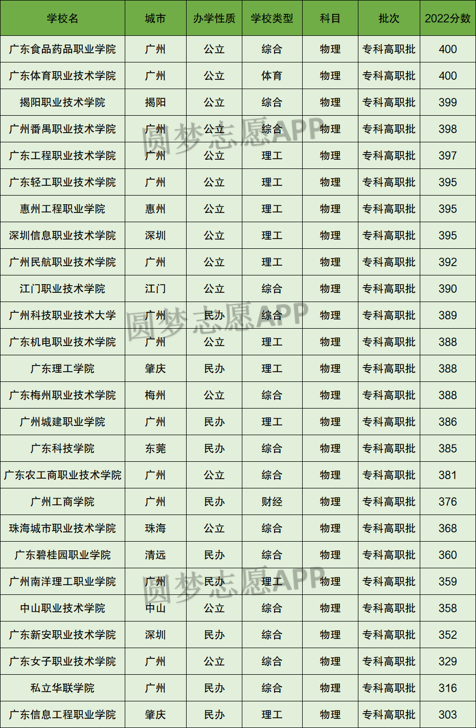 2022年广东省物理类本科线为445分,因此广东省300到400分的物理类大学均为专科批大学。