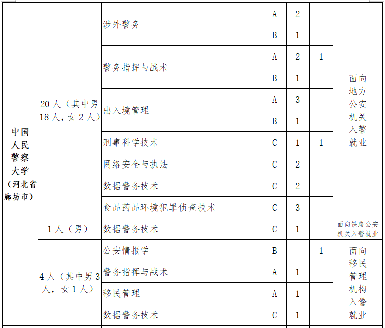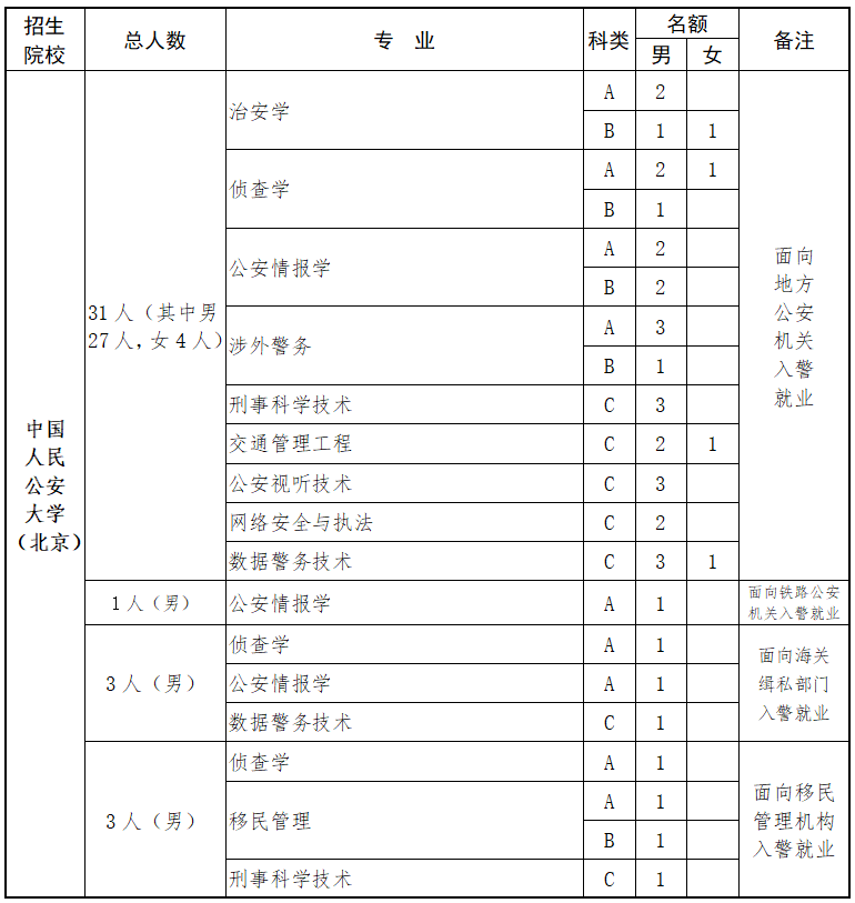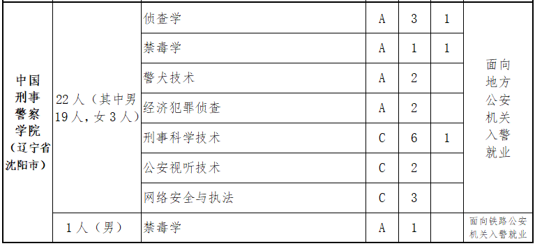 中国人民公安大学、中国人民警察大学、中国刑事警察学院、南京警察学院、郑州警察学院、福建警察学院、浙江警察学院。招生计划可见下: