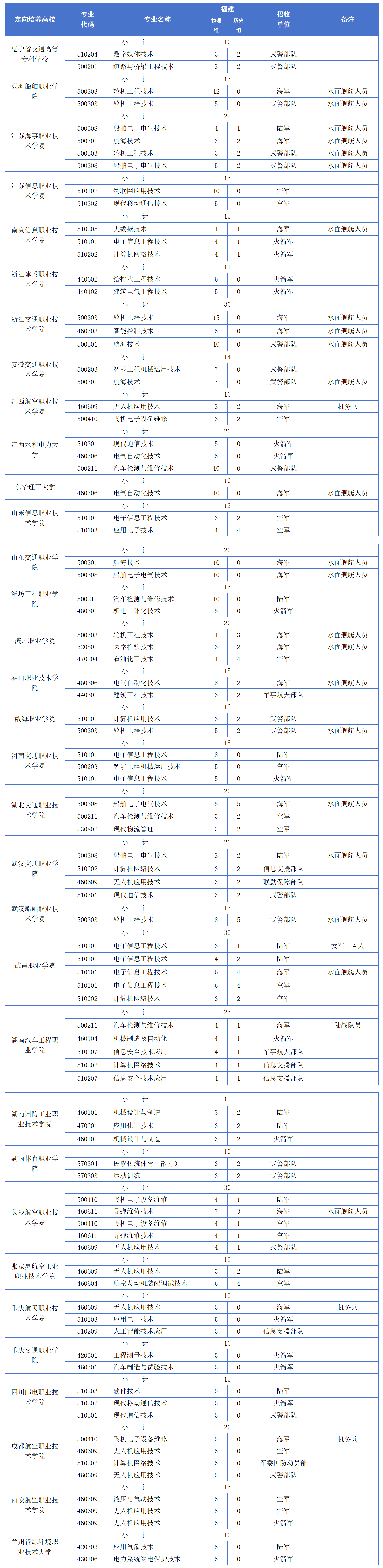 2025年在福建招生的定向士官院校共计33所,包括滨州职业学院、武汉船舶职业技术学院、浙江建设职业技术学院等,完整名单及招生计划表如下: