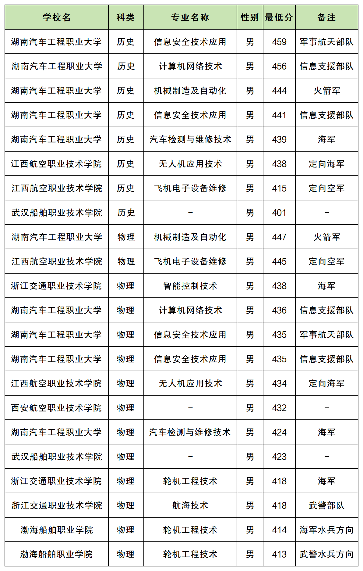 物理类:最低413分,男生,对应渤海船舶职业学院(武警水兵方向)。