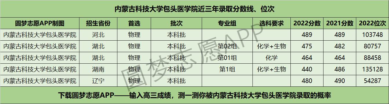 三、内蒙古科技大学包头医学院近年录取分数线及位次【首选物理版】