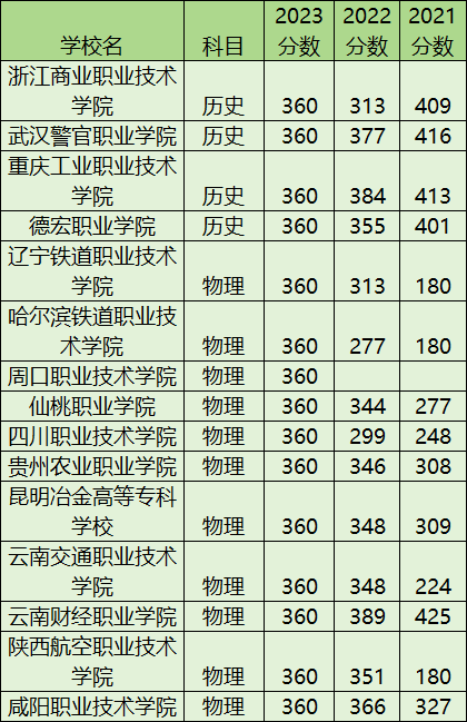 下图根据重庆高考2023年的录取数据,整理了360分对应的全部大学名单。360分历史类能上的大学包含浙江商业职业技术学院、武汉警官职业学院、重庆工业职业技术学院。360分物理类能上的大学辽宁铁道职业技术学院、哈尔滨铁道职业技术学院、周口职业技术学院等。