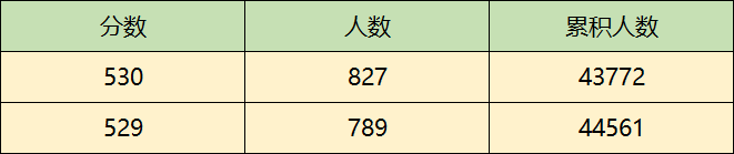 举个例子:下图为某省理科2019年的一分一段表,从表中我们可以看到,该省530分的考生一共有827人,530分即以上的累计人数为43772人,那么530分在该省2019年对应的最低位次为第43772名。