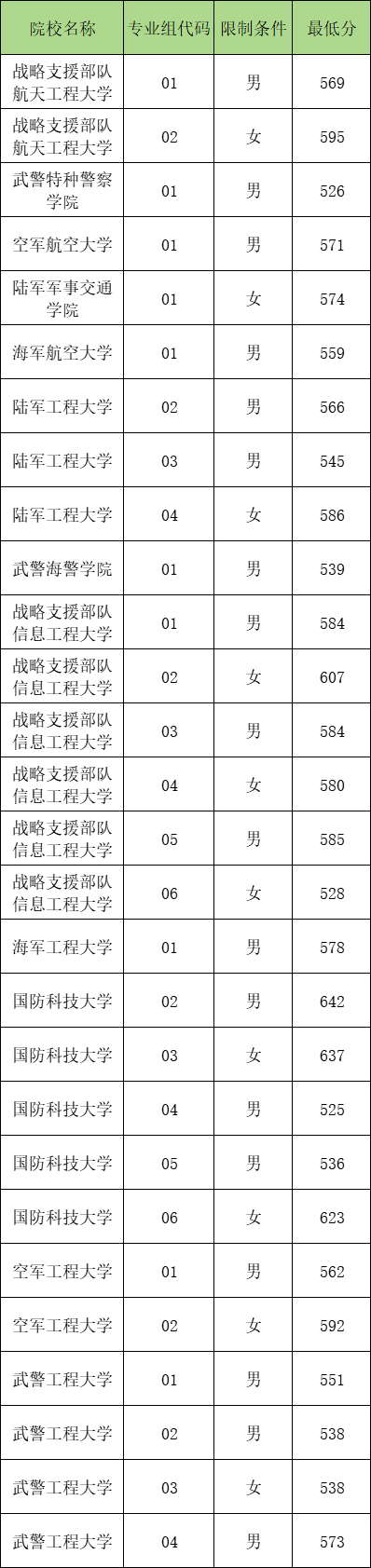 招生计划最少的是陆军特种作战学院和武警海警学院,都只招收1人,武警海警学院男生1人,陆军特种作战学院女生1人。