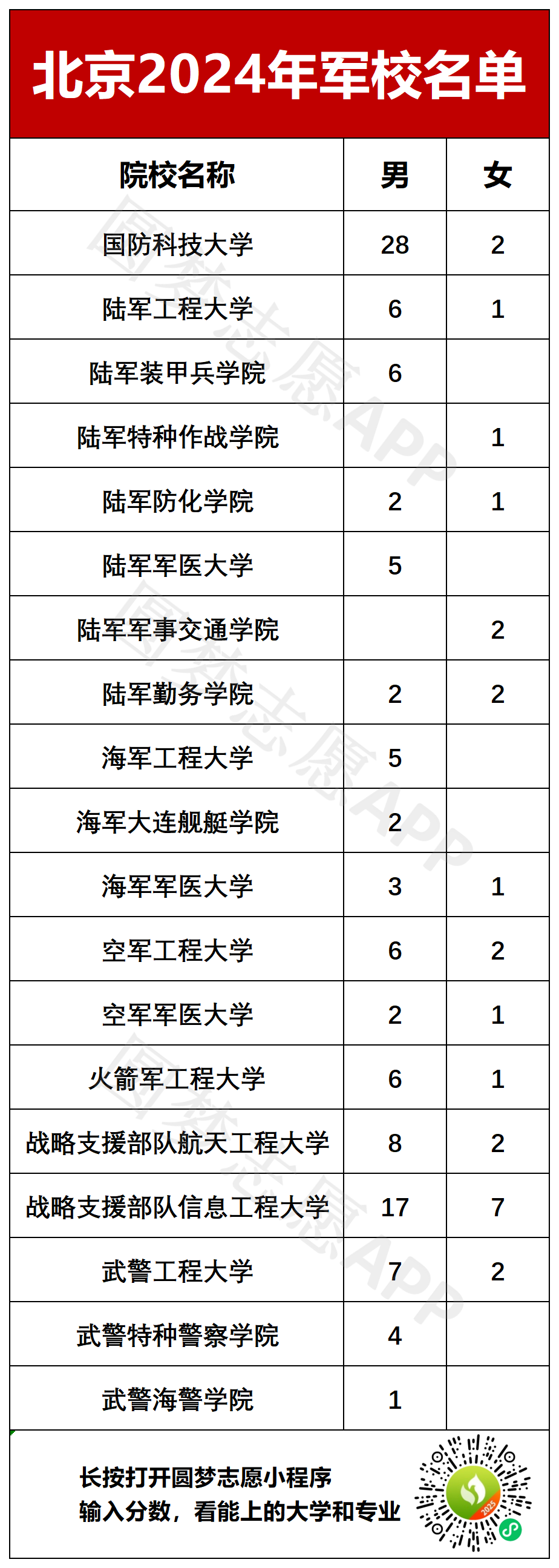 但是在北京招生的军校不止上述4所,根据2024年的招生计划来看,在北京招生的军校包括国防科技大学、武警工程大学、空军工程大学等19所,具体名单如下: