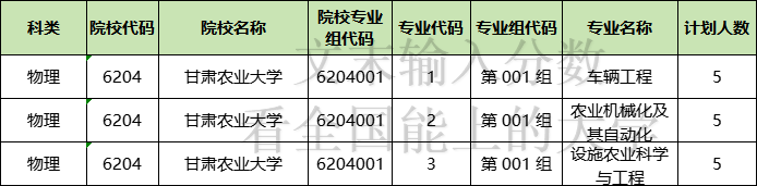第001组:专业组代码为6204001,包含车辆工程、农业机械化及其自动化、设施农业科学与工程。