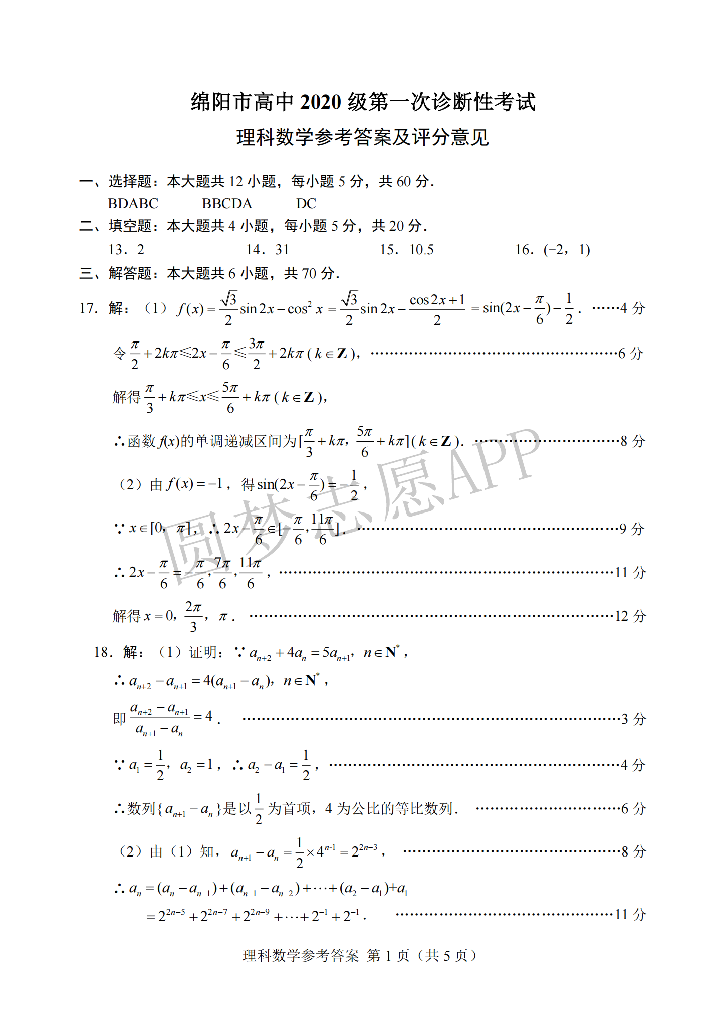 二、2023绵阳一诊理科数学答案解析
