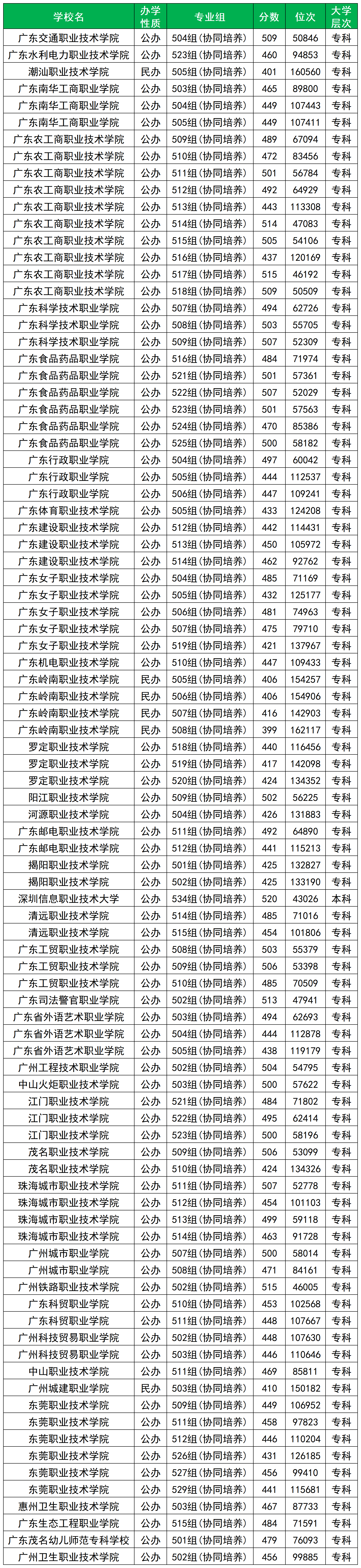 深圳信息职业技术大学520分,最低位次排名43026;广州铁路职业技术学院515分,最低位次排名46005;广东司法警官职业学院513分,最低位次排名47941;广东交通职业技术学院509分,最低位次排名50846。