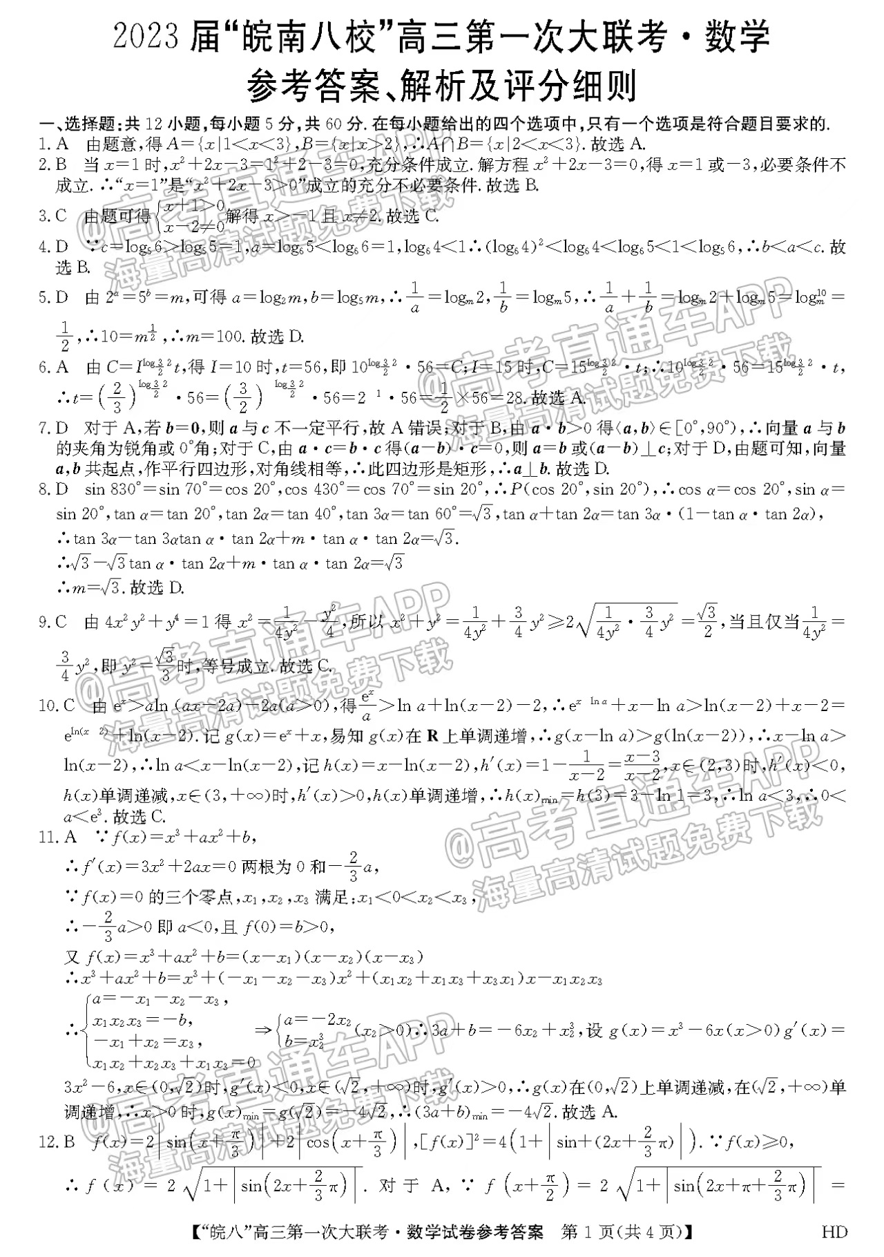 3、文科数学-2023皖南八校第一次联考文数试卷答案