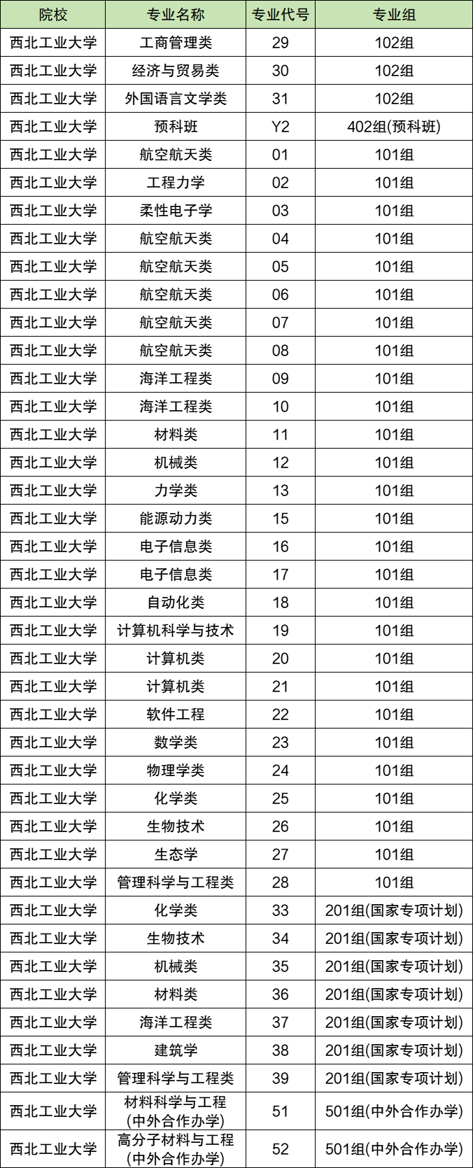 为降低志愿填报出错率,各校各专业(组)也拥有各自的代码,如西北工业大学第101组专业代码为:航空航天类01、材料类11、能源动力类15、计算机科学与技术19等。