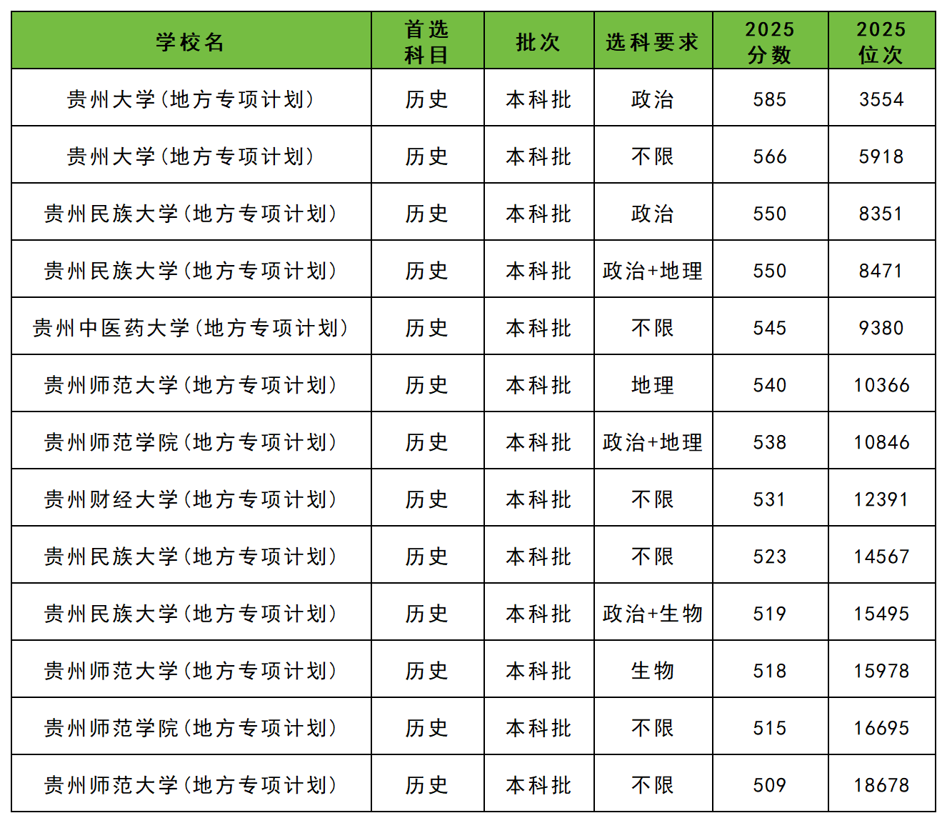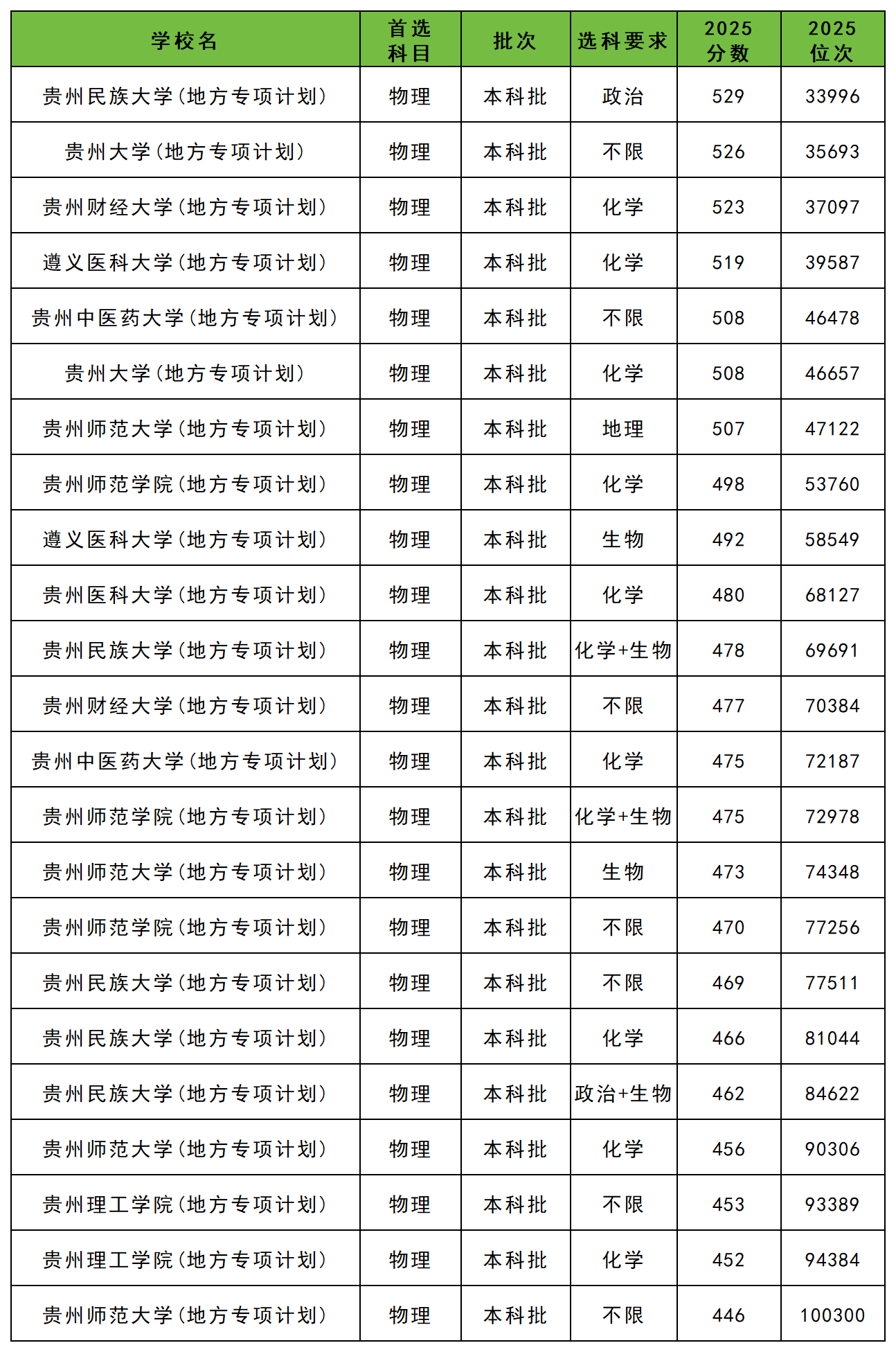 2025年贵州地方专项计划大学录取分数线一览表:
