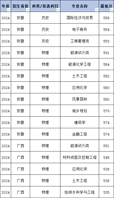 2024年广东工业大学国家专项计划在安徽录取最低分历史类为553分、物理类为574分,历史组收分最低的专业为工商管理类、物理组收分最低的专业为建筑学和金融工程。