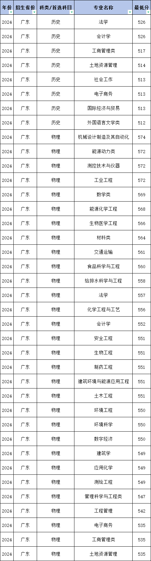 2024年广东工业大学地方专项计划在广东录取最低分历史类为512分、物理类为535分,历史组收分最低的专业为外国语言文学类、物理组收分最低的专业为电子商务、工商管理类和土地资源管理。
