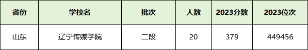辽宁传媒学院只在山东省招生,最低分数379分,共招生20人。