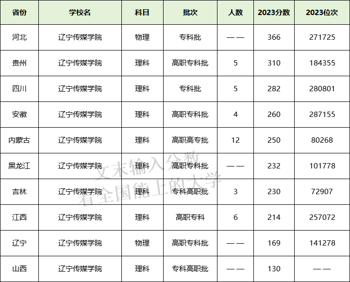 辽宁传媒学院专科在贵州理科最低310分、四川理科最低282分。本期将为大家整理2023年辽宁传媒学院各省专科分数线,以及2024年在各省的招生计划人数。