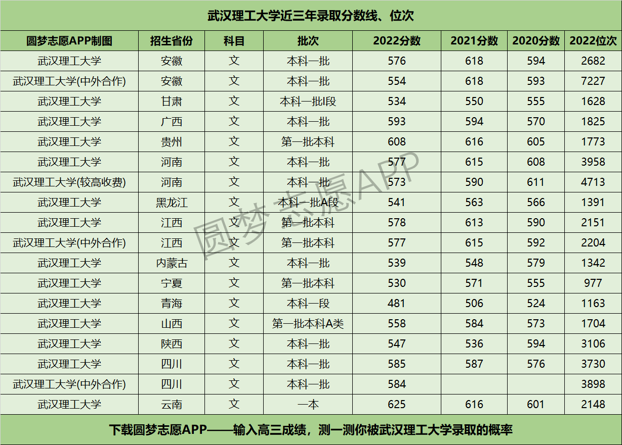 二、武汉理工大学近三年录取分数线及位次【文科版】