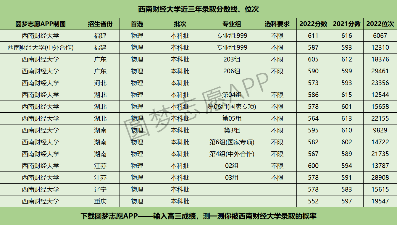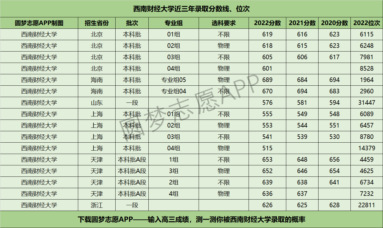 三、西南财经大学近年录取分数线及位次【首选物理版】