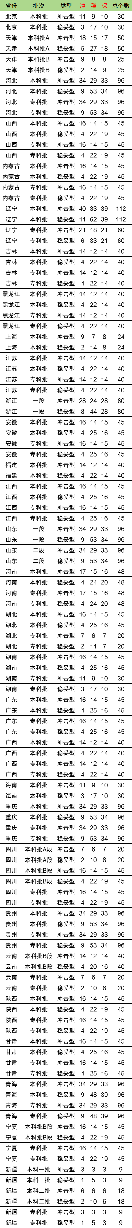 下面是老师整理的全国各省志愿个数以及冲稳保的最佳比例安排:
