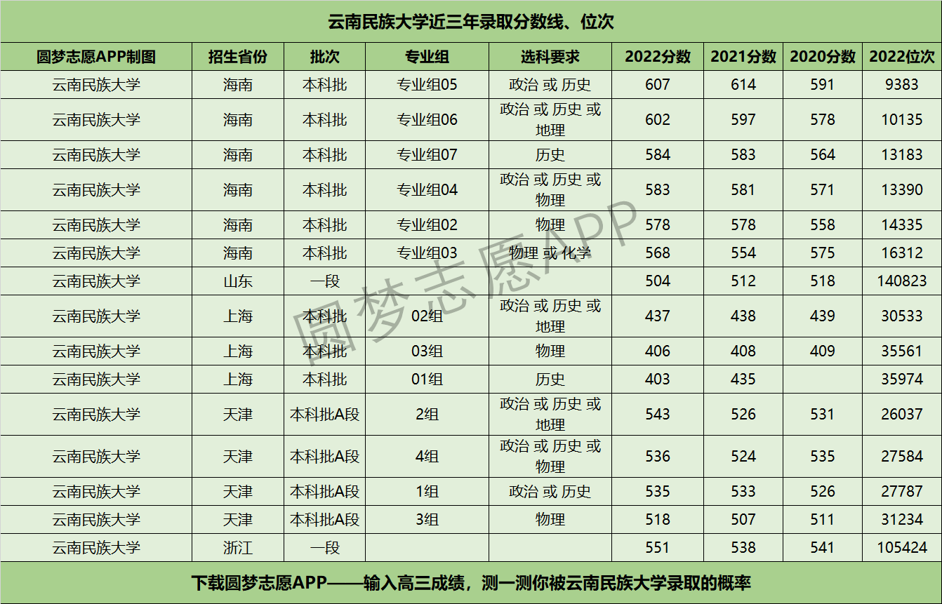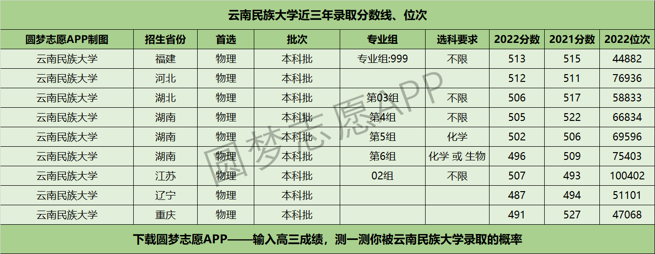 三、云南民族大学近年录取分数线及位次【首选物理版】