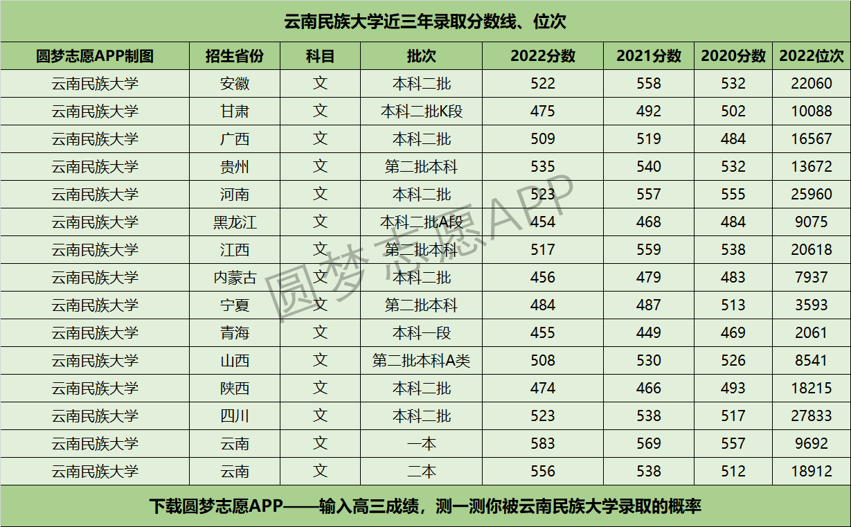二、云南民族大学近三年录取分数线及位次【文科版】