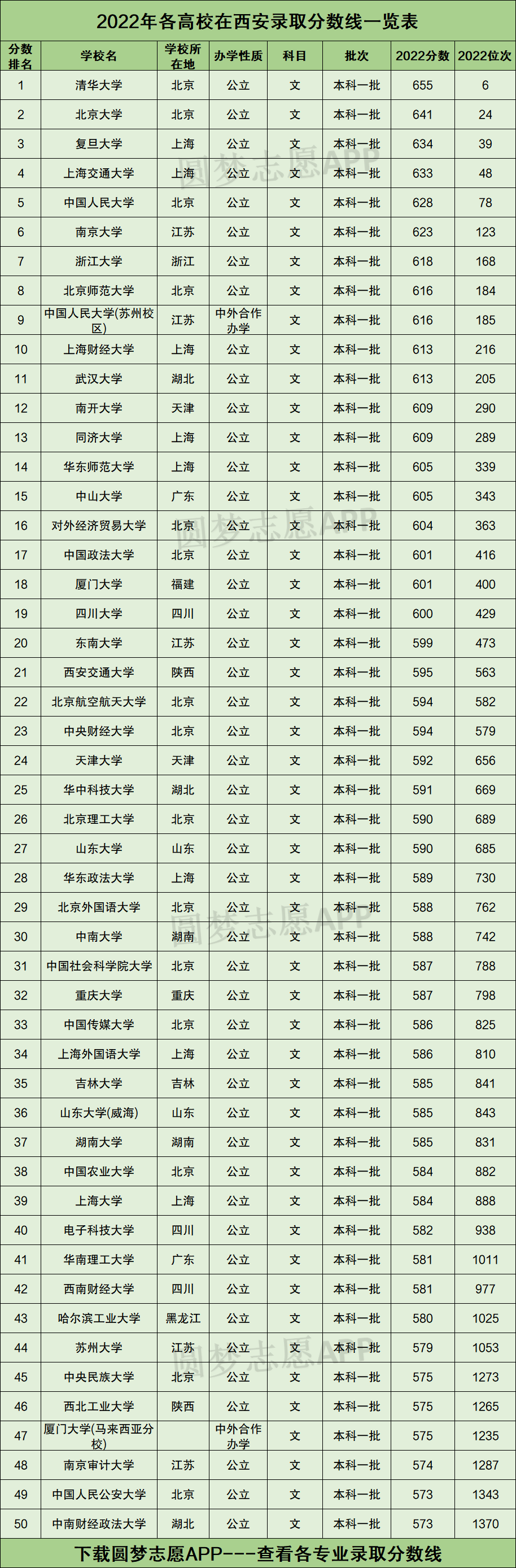 根据上图可知,2022年西安高三文科考生,只有成绩考到了573分以上、在全省文科考生中排名前1370名,才有机会被全国50强大学录取!