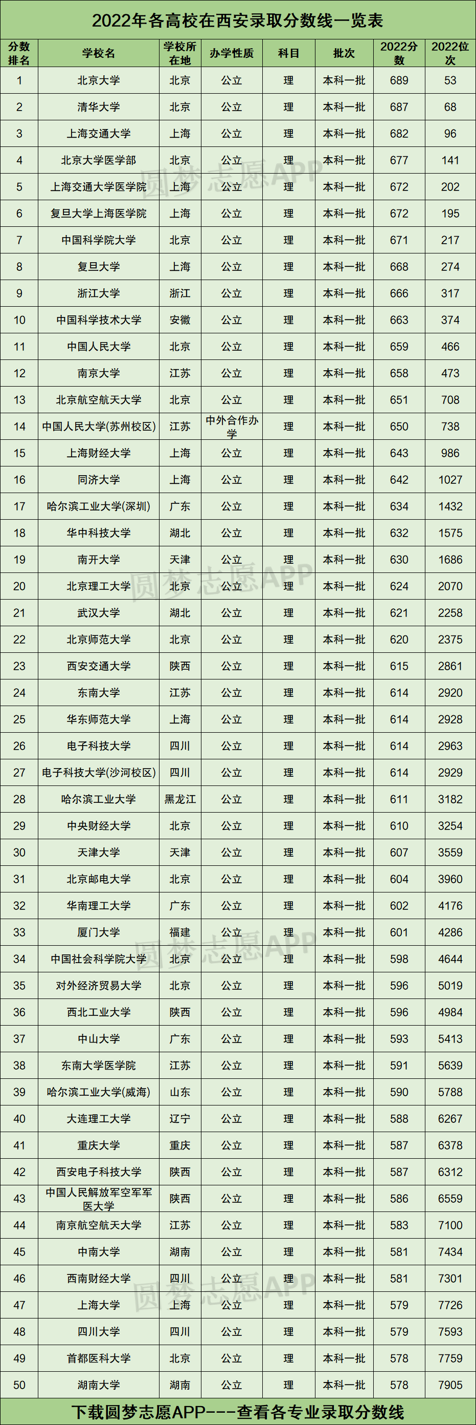 圆梦志愿根据考试院的数据,为大家整理了西安市内所有本科大学2022年高考理科的分数线及位次排名。具体见下图:
