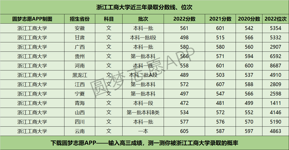 二、浙江工商大学近三年录取分数线及位次【文科版】