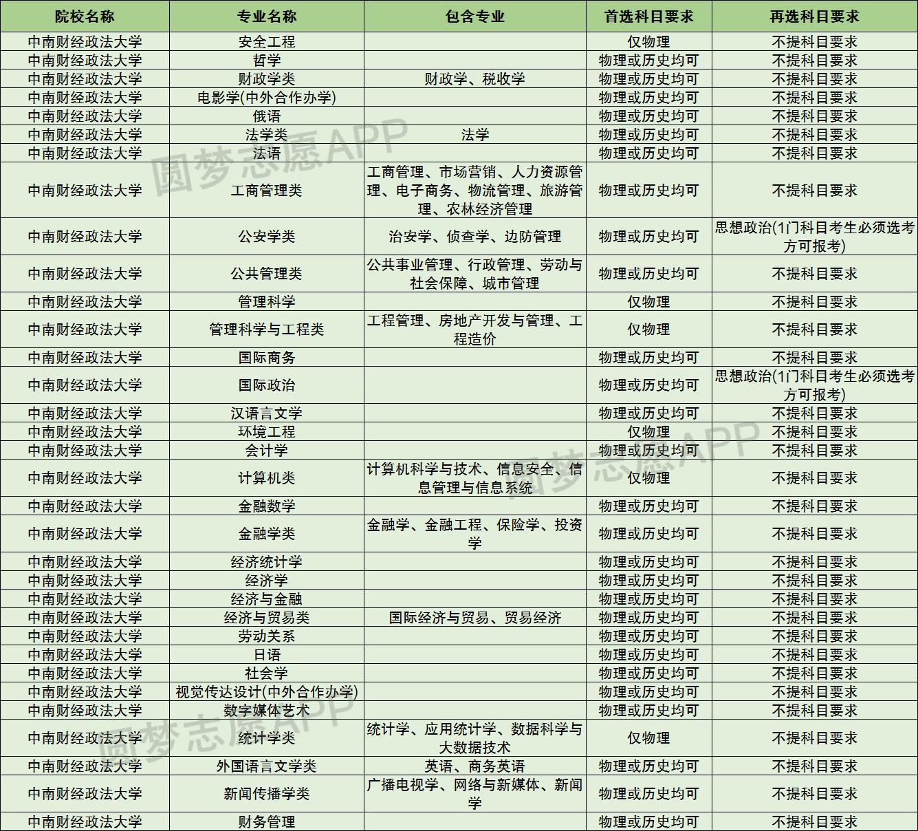 说明:高考时中南财经政法大学专业设置及选科要求可能会调整变化,正式填报时,要以中南财经政法大学2023年公布的招生计划为准。