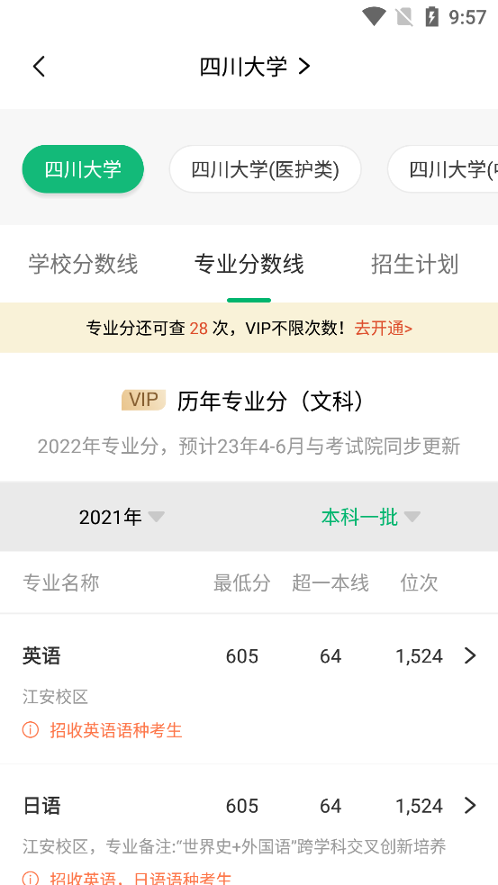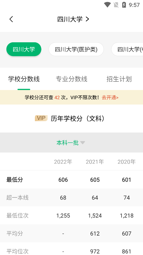 以四川大学为例,进入界面后,通过选择就可以看到四川大学各批次的院校分数线,还有各批次各专业的录取分数线,像四川大学这种医护类、艺术类与普通专业是分开招生的专业,点击也可查看相关的数据。