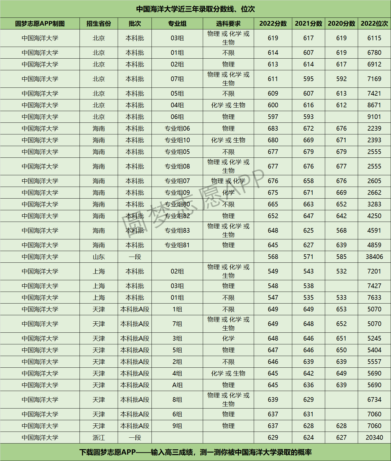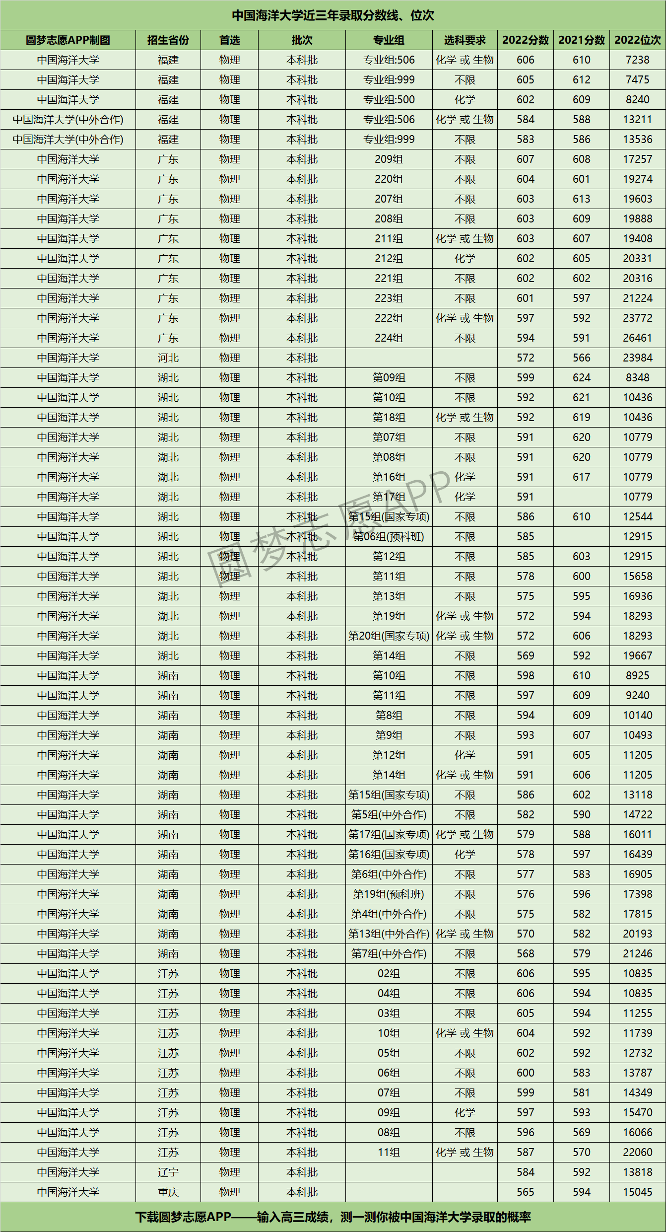 三、中国海洋大学近年录取分数线及位次【首选物理版】