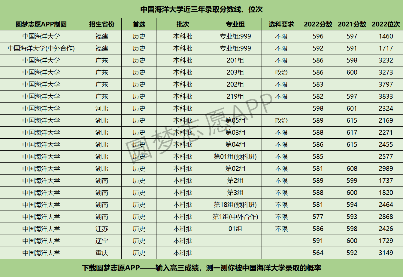 四、中国海洋大学近年录取分数线及位次【首选历史版】